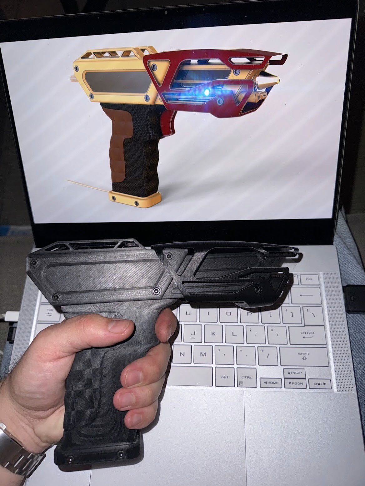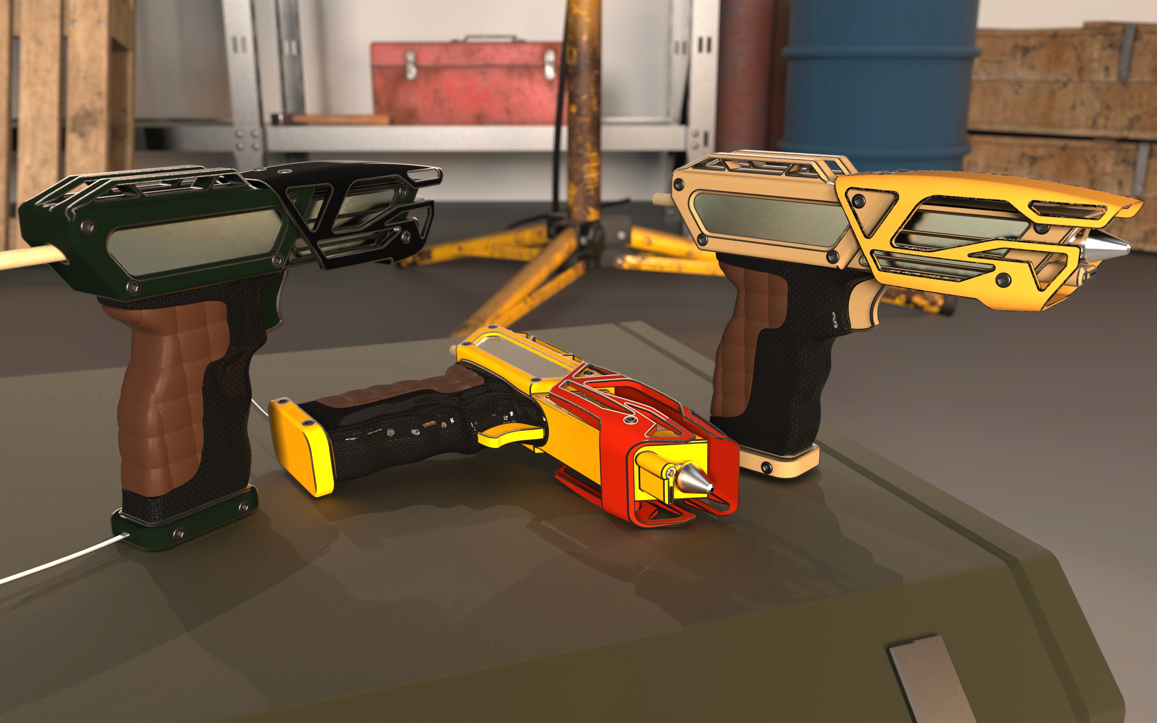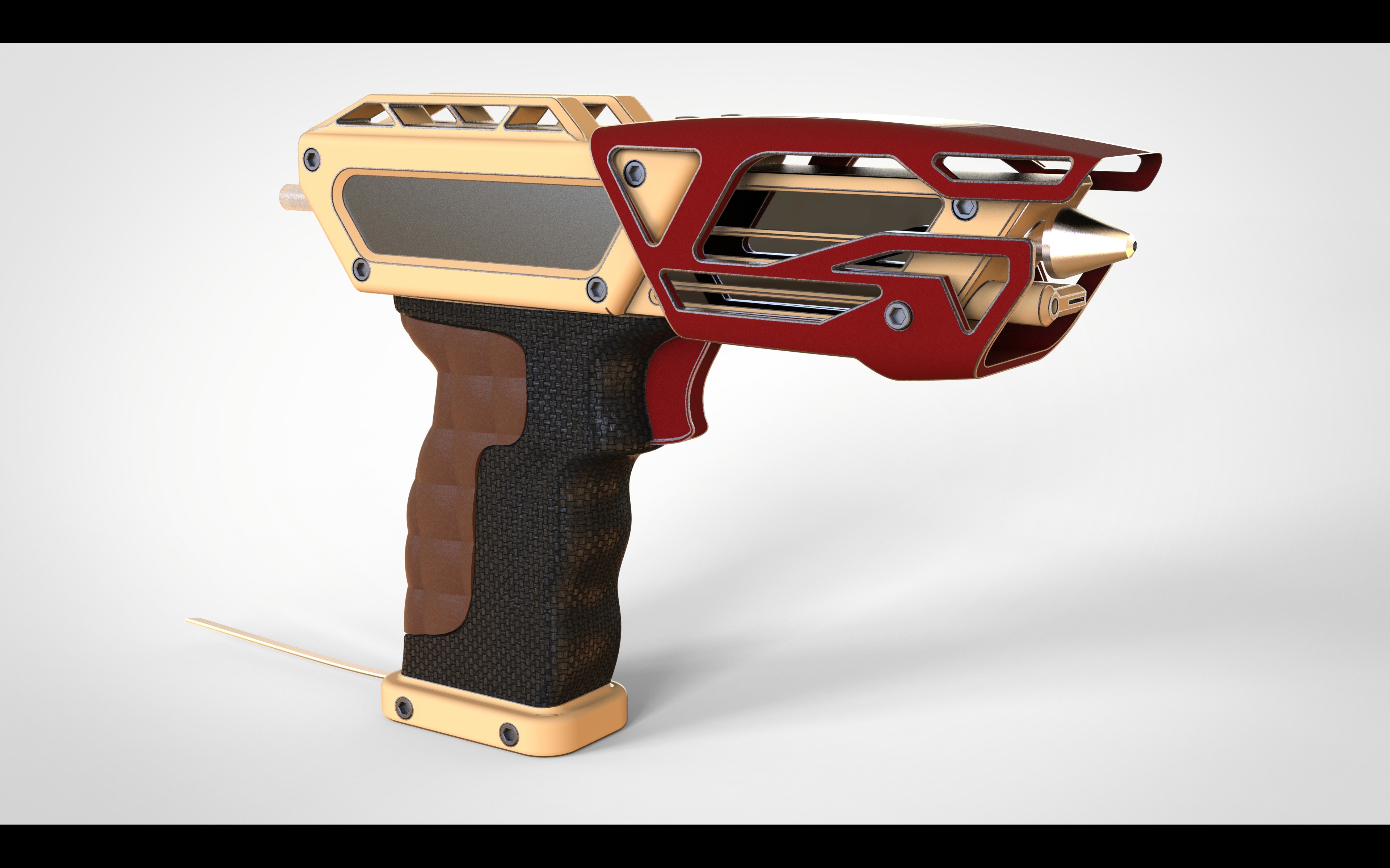 My design translates this aesthetic into a functional tool, combining exaggerated, stylized geometry with practical construction. The glue gun incorporates key internal components, including the trigger-driven feed mechanism (pusher and follower) and the heated nozzle assembly, ensuring the design remains grounded in real-world functionality.