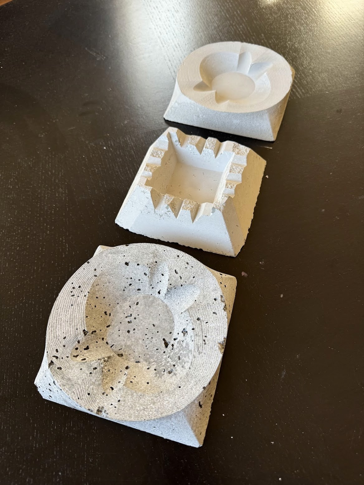 Before casting the final piece, I ran a series of smaller material tests to refine the concrete mix and achieve the desired strength and finish. As part of this process, I designed and cast multiple ashtray forms, using them to dial in proportions, curing behavior, and surface quality.